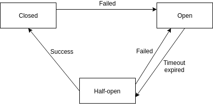 - Meio-aberto (Half-open): Depois de algum tempo (geralmente um timeout configurado), o circuit breaker, em um estado aberto, terá o estado alteado para meio-aberto. Neste estado, será permitida que uma requisição passe, e seja enviada ao serviço de destino. Caso ela falhe, o circuit breaker terá seu estado alterado para aberto novamente. Caso ela execute com sucesso, o circuit breaker terá seu estado alterado para fechado.