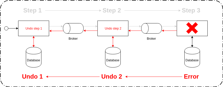 Como citado anteriormente, o ação do undo de um step é sensível ao contexto. Como exemplo, se estivermos falando sobre uma transação de negócio de venda, o primeiro passo (Step 1) pode ser a inclusão de um pedido, e a sua ação de “desfazer” pode ser o seu cancelamento, a sua exclusão, ou o que ficar de acordo com a necessidade do negócio.