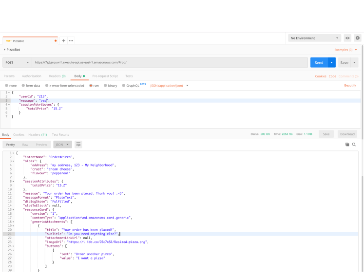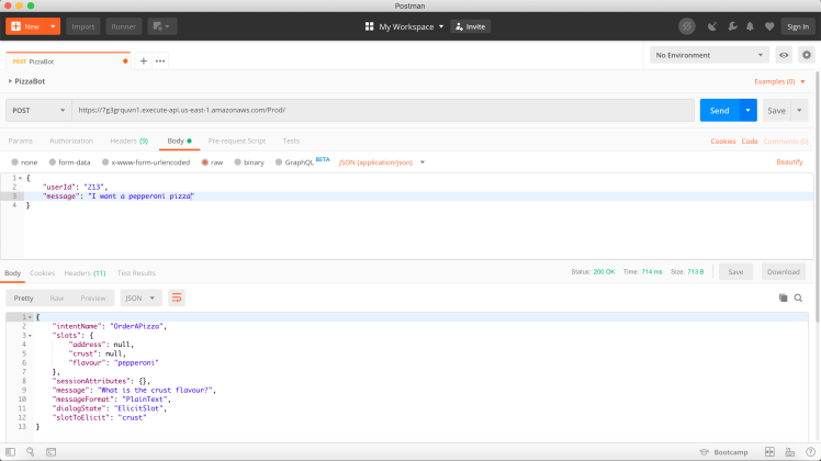 Na primeira requisição enviaremos a utterance (attributo message), para iniciar o intent, e o userId, que será usado para identificar a sessão. Na resposta do Lex, podemos identificar que ele iniciou o intent OrderAPizza, que o slot com o sabor da pizza já foi identificado, a mensagem solicitando o preenchimento do próximo slot, o slot que será preenchido, e o estado do diálogo (ElicitSlot).