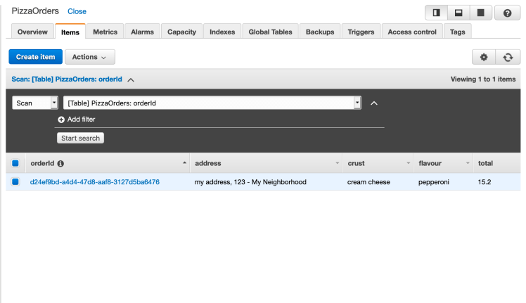 Para garantir que o pedido tenha sido criado, podemos conferir o DynamoDB.